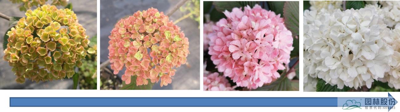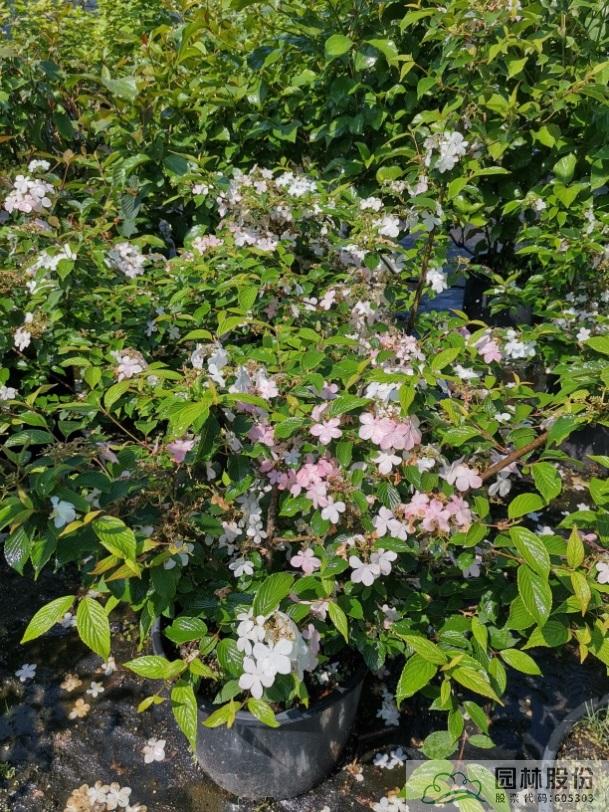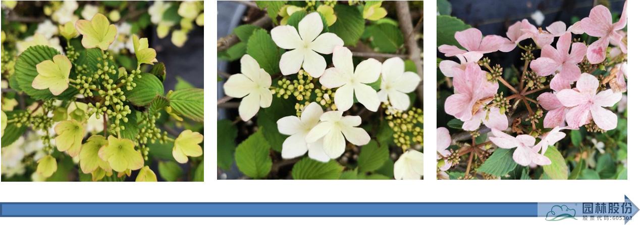 忍冬科莢蒾屬,落葉灌木,日本引進,株高可達2.5-3m。新葉成暗紅色,后呈綠色,秋色葉顏色多變。整個花序都是不育花,球形,花苞粉綠色,開放后淡粉色,最后變成白色。它適應(yīng)我國大部分地區(qū)種植,生長相對緩慢,適合園藝盆栽或庭院觀賞。