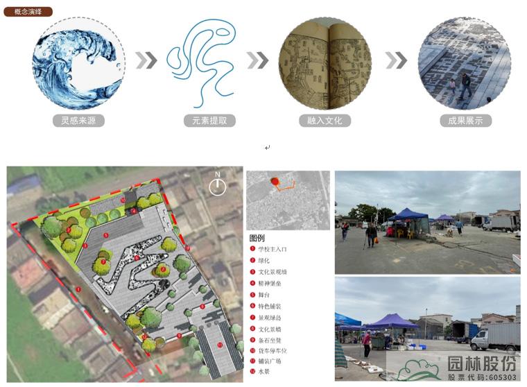 入口休閑廣場概念演繹設(shè)計(jì)說明:現(xiàn)狀場地主要為一片空地,由于南面是菜場,因此該場地在功能性上主要有貨車卸貨的功能,考慮村莊內(nèi)可能舉辦大型祭祀活動或者紅白喜事,需要有大空間,所以在設(shè)計(jì)中留出了大片場地。因沿海城市,所以提取了海浪元素,結(jié)合當(dāng)?shù)貧v史文化及村落肌理,做出如圖設(shè)計(jì)。
