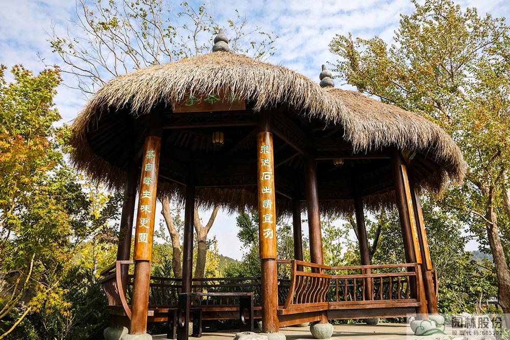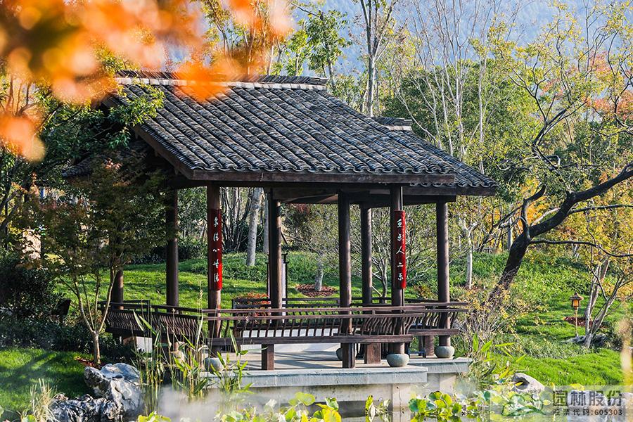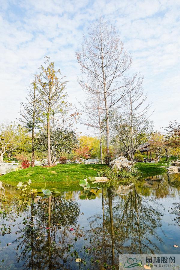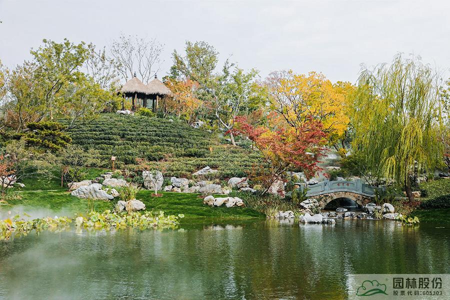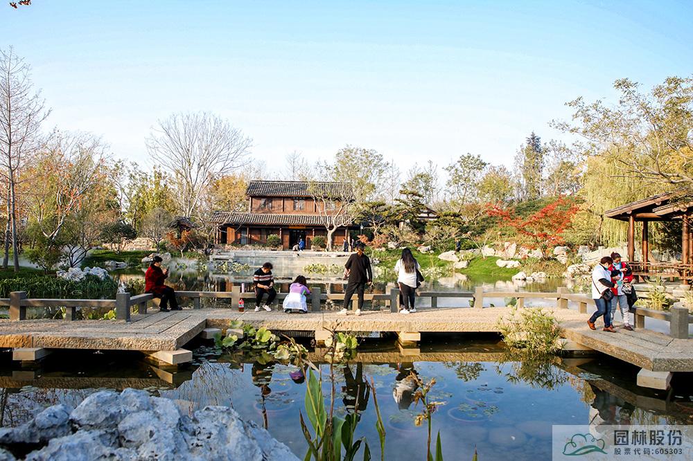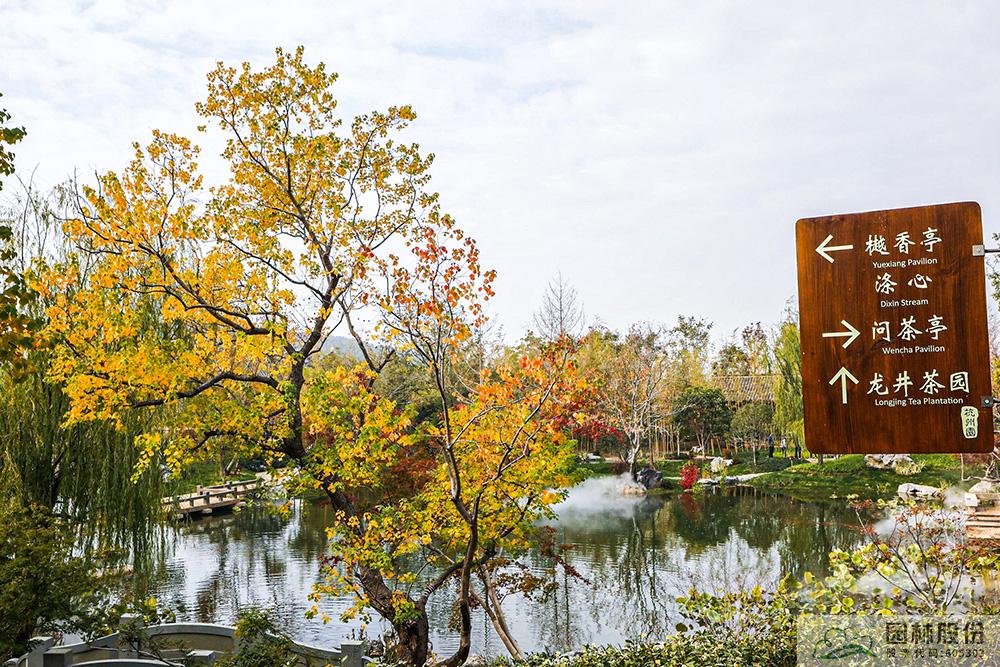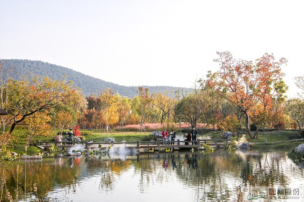 契合展區(qū)主題的樾香亭臨湖而立,雙坡屋面,八柱敞亭,柱子上書五言聯(lián)“魚樂(lè)人亦樂(lè),泉清心共清”,盡顯悠閑舒適的情趣。在亭內(nèi)憑欄而坐,側(cè)耳聽(tīng)風(fēng)雨,迎風(fēng)嗅花香。抬頭遠(yuǎn)望,荷葉亭亭的水面上,有魚兒在水中嬉戲;曲折的長(zhǎng)橋上,游人在漫步觀景;水岸邊,銀杏、三角楓、烏桕等色彩繽紛,編織出一幅深秋的美麗畫卷。