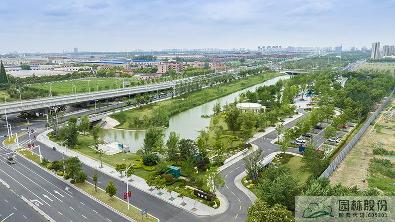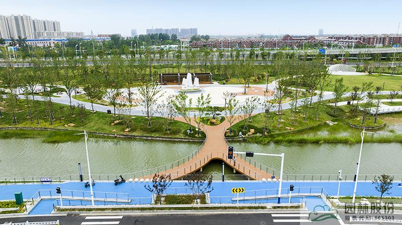 水系貫穿整段綠地,綠道、景觀橋穿插其中,沿途設(shè)置平臺、廊架等,充分呼應(yīng)水網(wǎng)與路網(wǎng)交織主題。水系駁岸既有草坡入水,又有仿木樁駁岸,點(diǎn)綴景石,搭配疏密相間的綠化,共同形成了生態(tài)多樣的生態(tài)水岸。