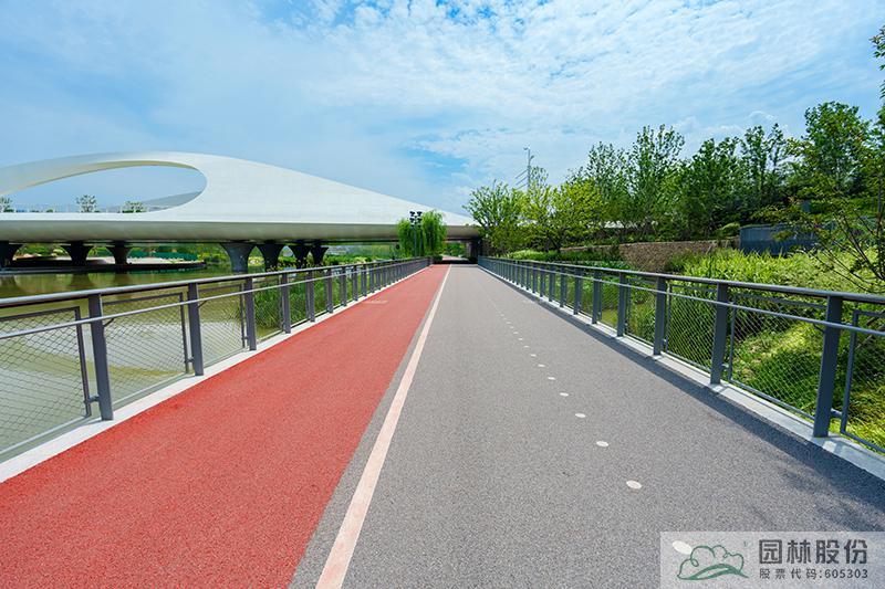 城市綠道通過鋪裝材質(zhì)區(qū)分出騎行道和跑步道。騎行區(qū)域采取瀝青材質(zhì),提高耐久度和使用壽命,有效控制成本造價。跑步道區(qū)域采用EPDM塑膠顆粒面層,提高使用舒適度,采取靚麗的色彩與騎行區(qū)域進行區(qū)分。結(jié)合人才驛站設(shè)置瞭望臺,游人在此可小憩補充體力,也可登高俯瞰河道景觀。造型獨特的驛站和瞭望臺也是河道上的一處風(fēng)景。