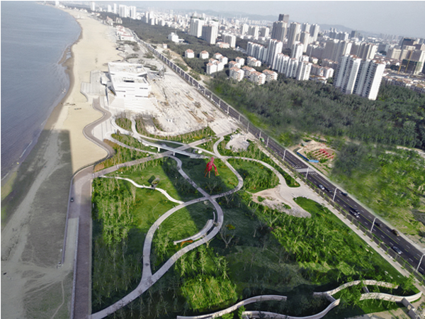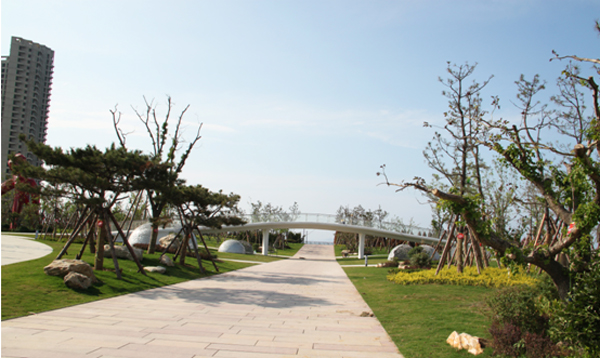 人行路橋高6米,長60米,與園路相互連接,立于橋上,可觀四季美景,覽海灘盛宴,是廣場中觀景的好去處。