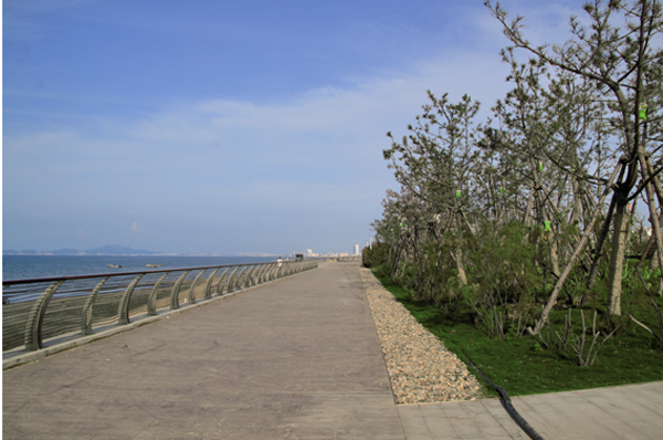 煙臺屬暖溫帶季風(fēng)氣候,但是瀕海地又受到海洋性氣候的影響,經(jīng)常受海潮海風(fēng)侵襲和土壤鹽漬化、干旱化威脅,導(dǎo)致適宜生存的植物種類少、綠化難度大。該項(xiàng)目緊臨海邊,因此,如何正確選擇植物品種,在提高植物成活率的同時又保證景觀效果的豐富,是其面臨的一大難題。