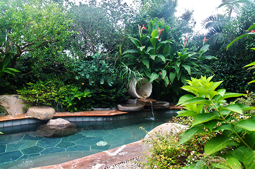 露天泳池?zé)釒эL(fēng)情,溫泉泡池仿若天成。露天泳池區(qū)景觀獨(dú)具特色,選用華棕、棕櫚、布迪椰子、加拿利海棗等熱帶植物作為主景,營(yíng)造出簡(jiǎn)約大方、層次分明的濃郁熱帶園林風(fēng)情。為了提高這些熱帶植物的成活率,降低后期的養(yǎng)護(hù)成本,這批植物都經(jīng)過(guò)馴化,較能適應(yīng)吳江的氣候條件。該區(qū)面積較大,從酒店的觀景平臺(tái)上往下看,泳池中間的小島就像彎彎的小船,仿佛要順流而下;水質(zhì)清澈見(jiàn)底,水底大面積的藍(lán)色和黃色玻璃馬賽克,營(yíng)造出波光鱗鱗的效果,流動(dòng)的線條瞬間充滿(mǎn)了生機(jī)和活力,整個(gè)泳池仿佛都動(dòng)了起來(lái)。