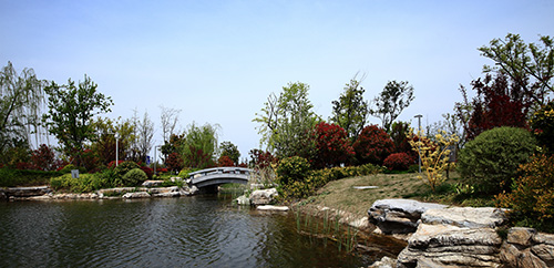 其中,人工湖面積7000平方米,小而精致,可謂是整個公園的“點睛之筆”。由親水平臺區(qū),源頭區(qū),中心湖面區(qū),鄰水生態(tài)區(qū),橋梁區(qū)構(gòu)成。湖面區(qū)域貫穿整個工程,沒有自然條件的襯托,完全由人工園林造景手法完成,在鄰水景觀帶種植睡蓮、荷花、再力花、千屈菜、鳶尾、蘆葦?shù)人参?,營造生態(tài)岸線,同時選擇其他親水植物,如美人蕉、碧桃、楊柳、水杉作為過渡和背景,虛實結(jié)合,營造出多方位的景觀效果。湖面雖小,但結(jié)構(gòu)完整,假山疊水,拱橋,原石臨水橋,湖邊卵石生態(tài)群落一應(yīng)俱全。其中,景石主要使用了安徽的靈璧景石,約7000噸,堆疊出水源、暗橋、親水沿岸等景觀。