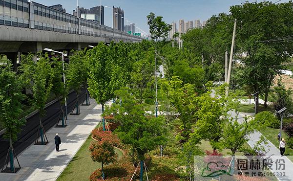 本項目全線綠道貫通,與周邊地塊無縫銜接,并根據(jù)局部特點因地制宜地變化綠道穿行,其中恢復(fù)綠地以臨人行道式、綠地穿行式、借用人行道式,新建綠地以綠道穿行式為主。遮蔭樹林以散植、片植等形式結(jié)合綠道布置,注重林下空間營造,切實做到景觀以人為本,為民服務(wù)。