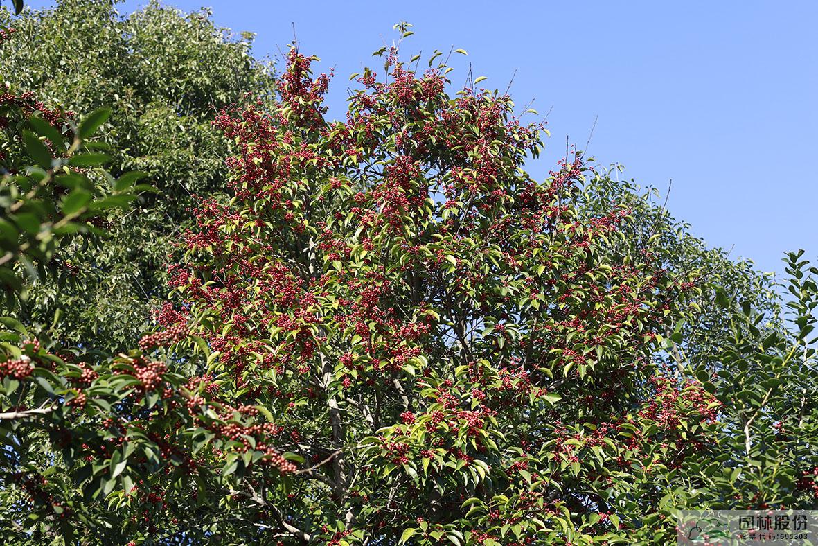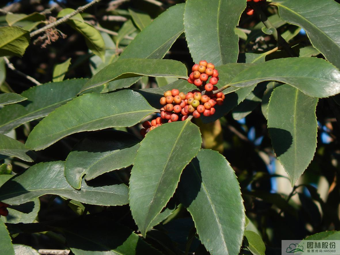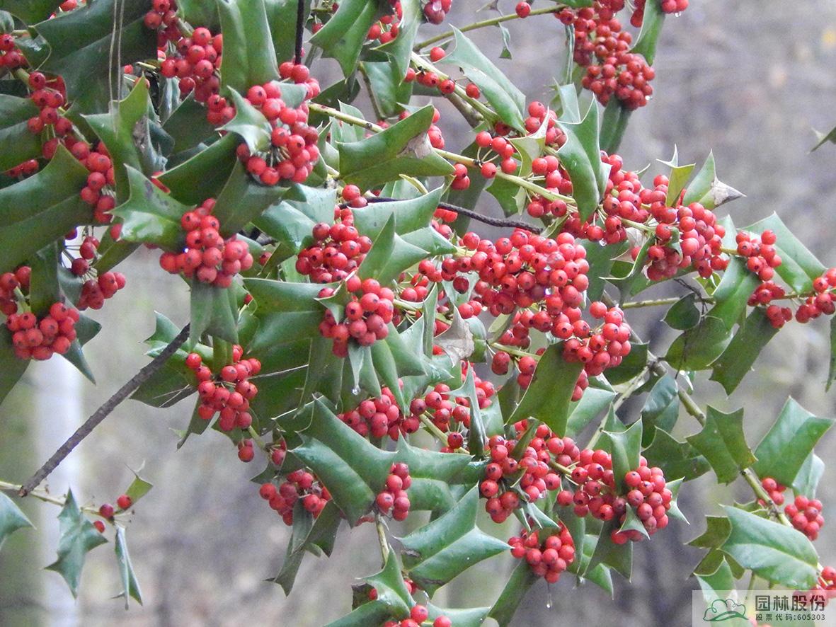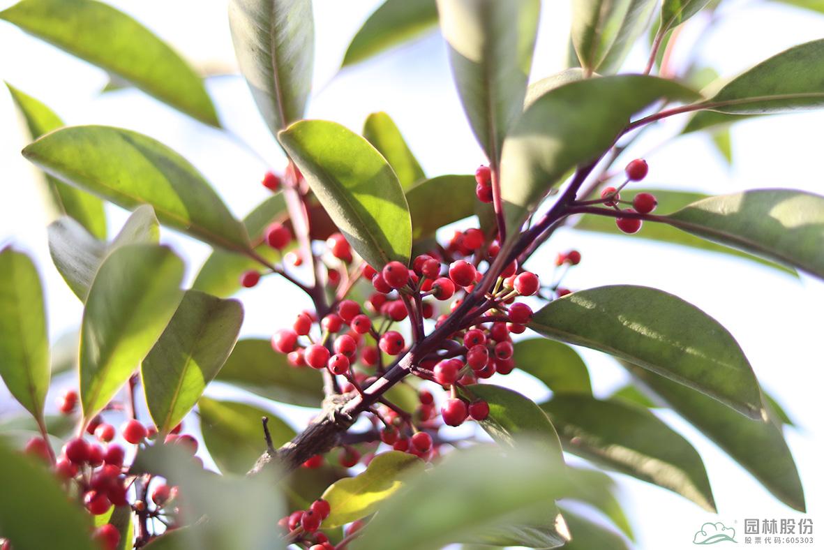鐵冬青:其葉子四季常青,故名鐵冬青。為常綠喬木或灌木,高可達(dá)20米,葉全緣。果實(shí)紅色,紅若丹珠,小巧可人。掛果期長,能從10月一直持續(xù)至來年3月。因有多子多孫,興旺發(fā)達(dá)之意,在民間俗稱“萬子千紅樹”。樹皮或根皮為中藥“救必應(yīng)”,具清熱解毒,利濕的功效。為優(yōu)良觀果樹種,適宜在園林中孤植或群植。