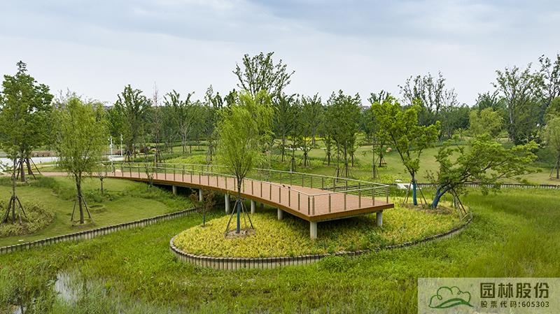 水系貫穿整段綠地,綠道、景觀橋穿插其中,沿途設(shè)置平臺、廊架等,充分呼應(yīng)水網(wǎng)與路網(wǎng)交織主題。水系駁岸既有草坡入水,又有仿木樁駁岸,點(diǎn)綴景石,搭配疏密相間的綠化,共同形成了生態(tài)多樣的生態(tài)水岸。