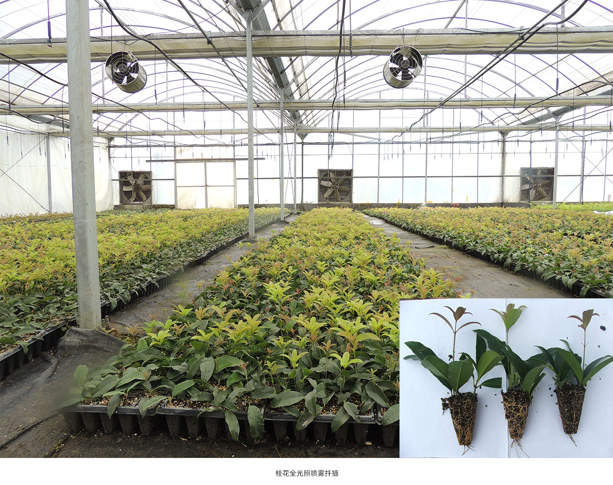(1)全光照噴霧扦插育苗技術 全光照噴霧扦插技術具有生根期短、成活率高和操作簡單等優(yōu)點。研究院已建立了桂花、冬青、降香黃檀、新優(yōu)宿根植物等數(shù)百種植物的全光照噴霧扦插技術體系,年度育苗量200多萬。